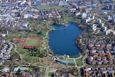 |  source  Luftbildsuche.de (1)FKK area on left side of lake, next to sports field |  source  Flickr.com (2)FKK area across lake toward far left |  source  Flickr.com |  source  Google Maps |