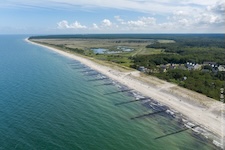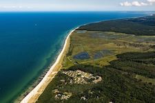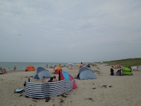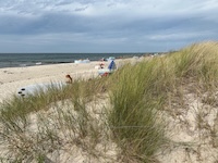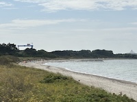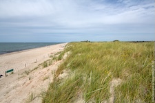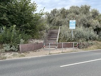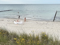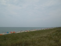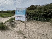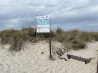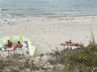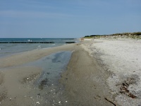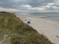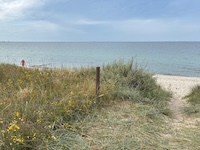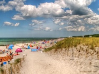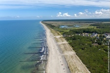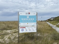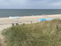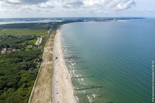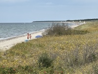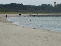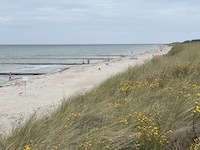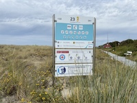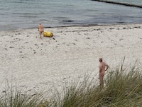 Hohe Düne and Markgrafenheide are adjacent coastal districts of Rostock, and the continuous beach that spans the districts is over 5 kilometers long. The consecutively numbered beach accesses range from 2 to 34, with the numbers ascending going east and north from a marina at the far eastern end of the beach. Strand Hohe Düne extends from the marina to access 13. Strand Markgrafenheide begins at access 13 and extends beyond access 34, blending into a remote stretch of coastline that belongs to districts of Rostock that are virtually depopulated. A long stretch of beach between accesses 4 and 23 is signed as FKK, while a comparatively short stretch of beach between accesses 32 and 34 is also signed as FKK. Starting at access 34, the remote area to the northeast is designated as a swimwear-optional zone, signed FKK+Textil. In reality, lots of textiles frequent parts of the beach signed as FKK. The 4-23 and 32-34 areas are de facto swimwear-optional zones despite signage that implies that nudity is expected.