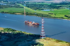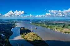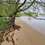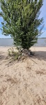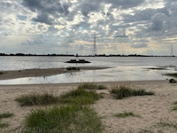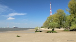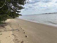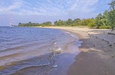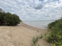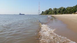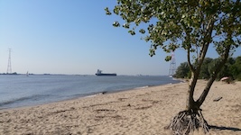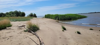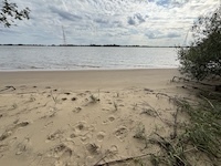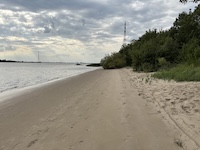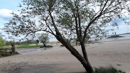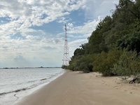 (1) entire beach on right side of river opposite island, with southeast end toward far right and northwest end farther left