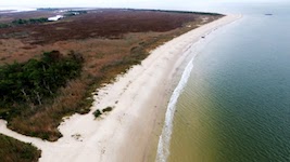 (1) This photo shows the southern area of the beach, with the access path at the bottom left corner. The nude area is out of view along the top of the photo, around the bend from the prominent curve of the beach that is toward the upper right corner.